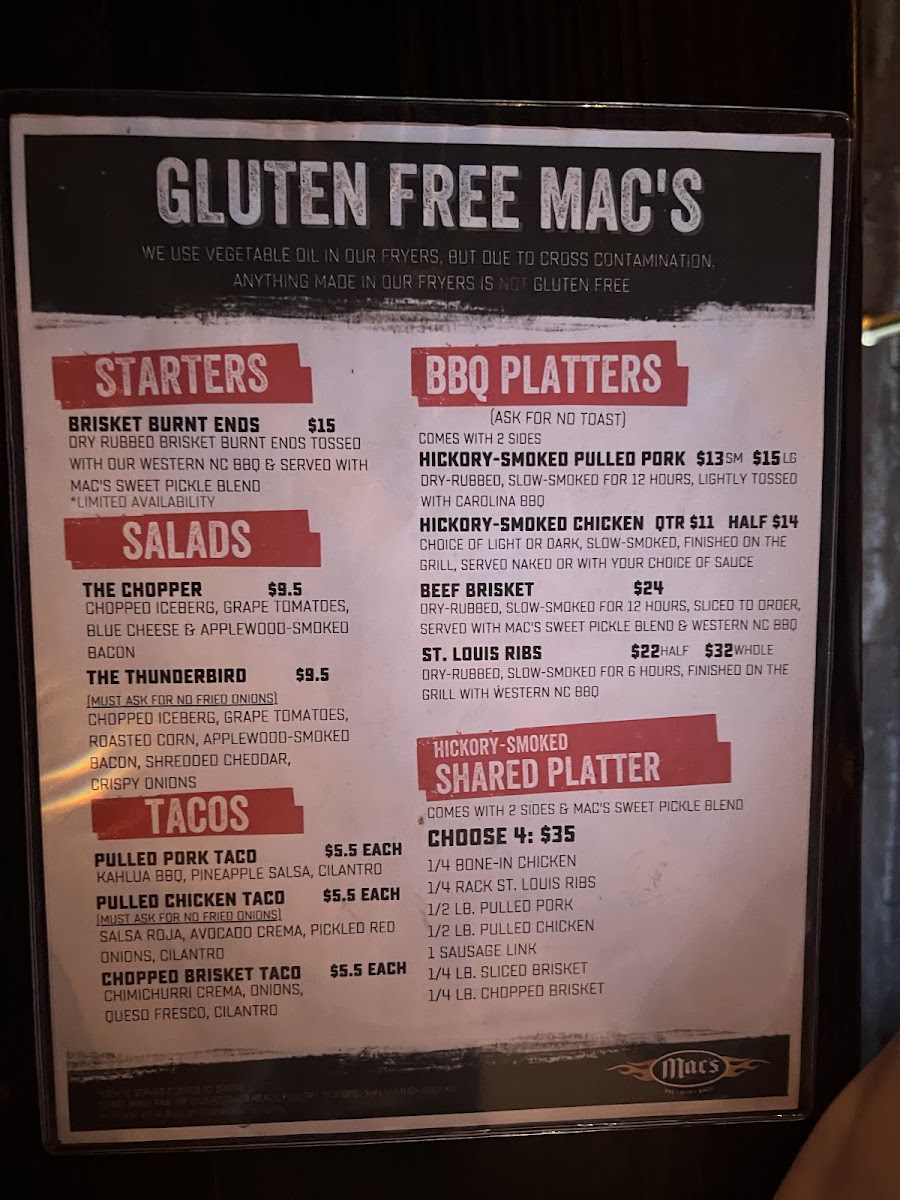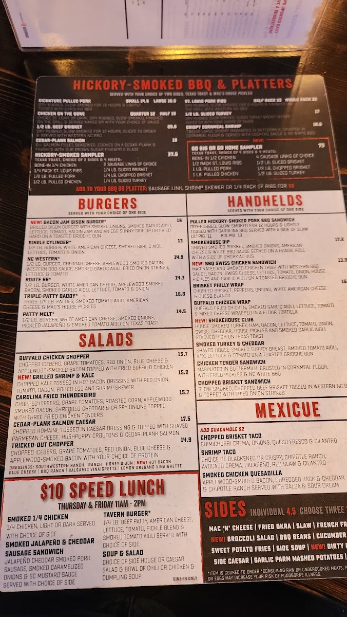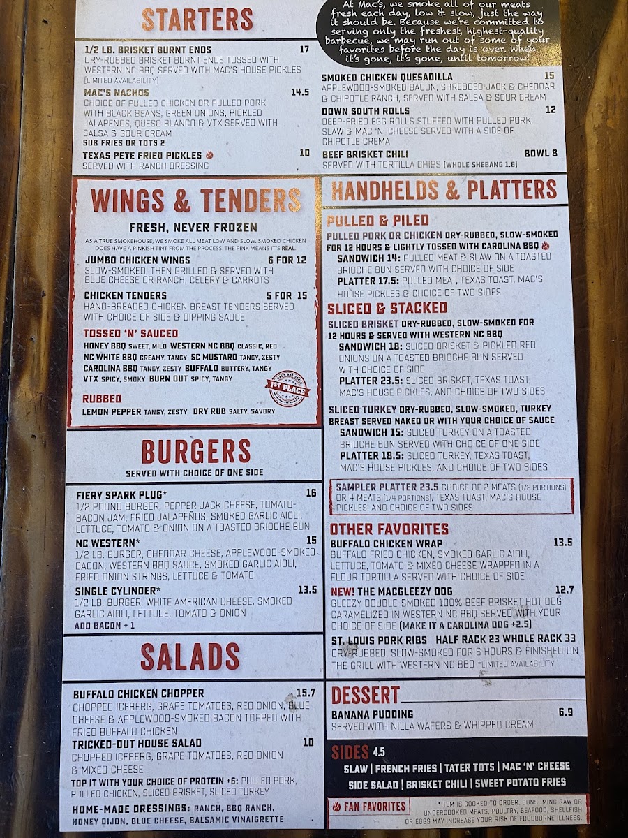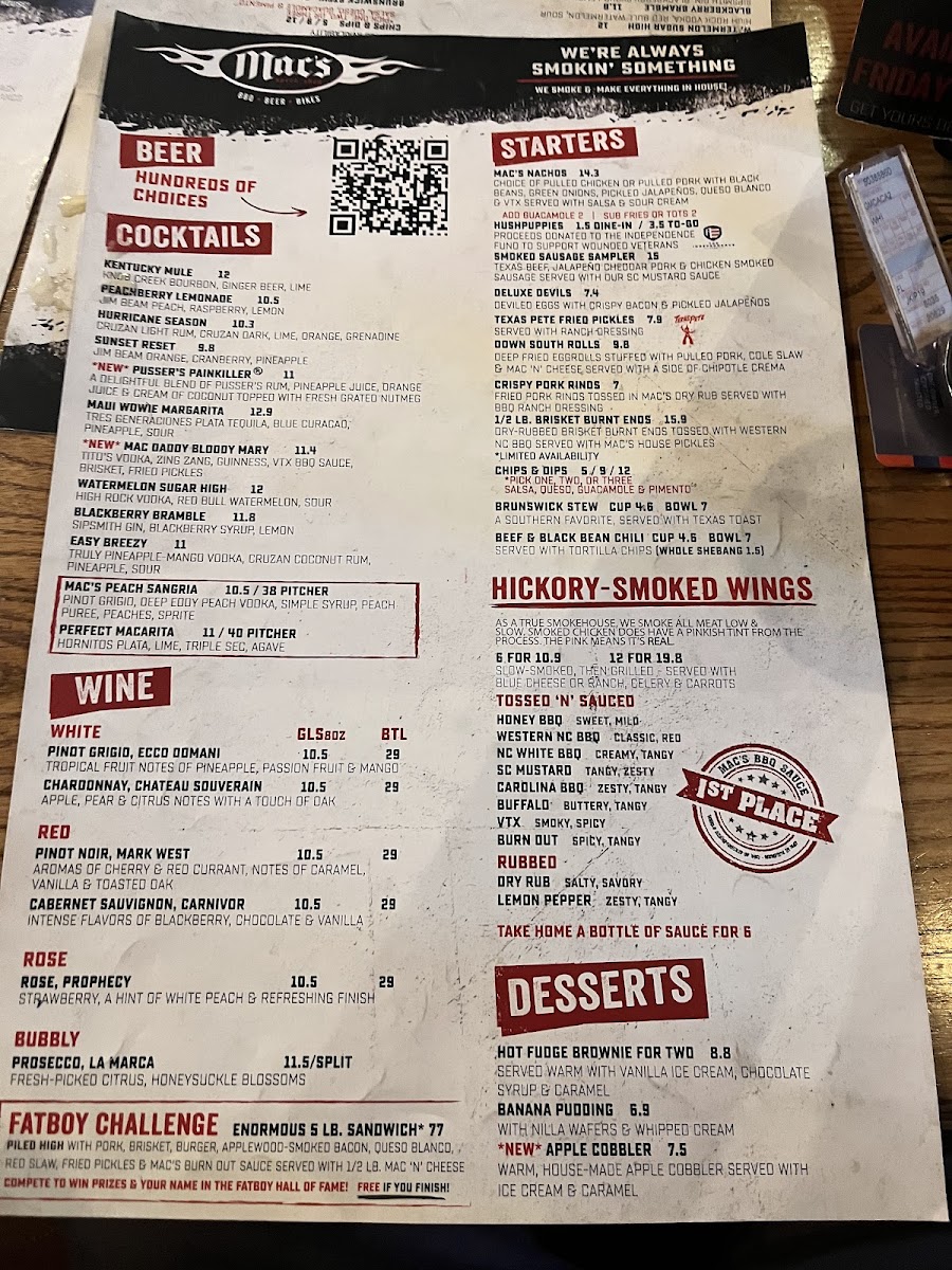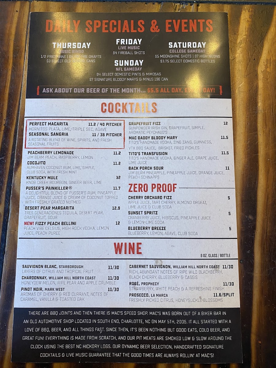 At Mac's Speed Shop Menu, you'll find a delicious selection of classic American comfort food, with a southern twist. Whether you're in the mood for juicy smoked meats, tender ribs, or mouth-watering burgers, there's something to satisfy every craving. Their menu features hearty BBQ plates, flavorful sandwiches, and tasty sides that pair perfectly with a cold drink from their extensive beverage list. Known for their laid-back vibe and friendly service, Mac’s Speed Shop takes pride in offering food that’s as satisfying as it is flavorful. So, if you're in Raleigh and looking for a great spot to unwind while enjoying some great food, this is the place to be.