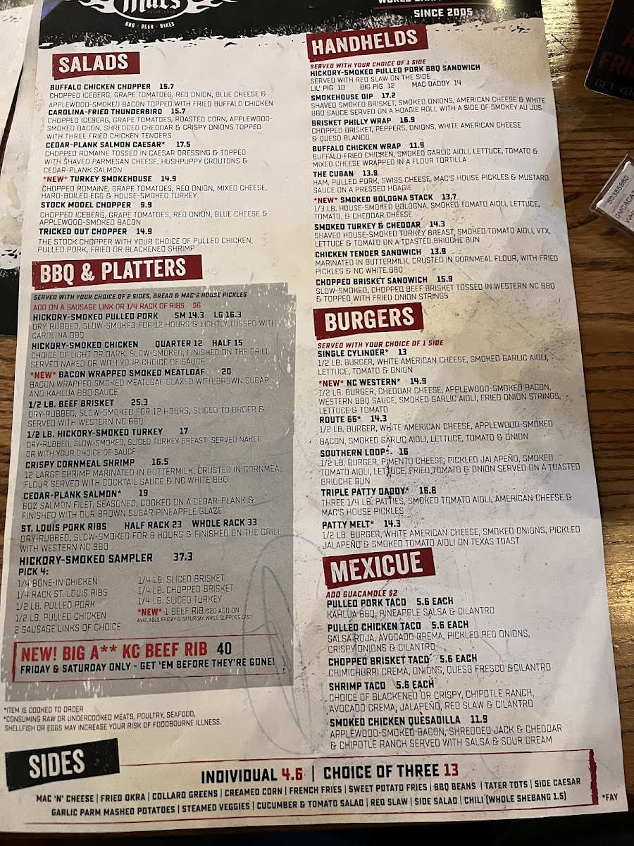 Choice of 4 meats (1/4 portions) texas toast, mac’s house pickles, and choice of two sides